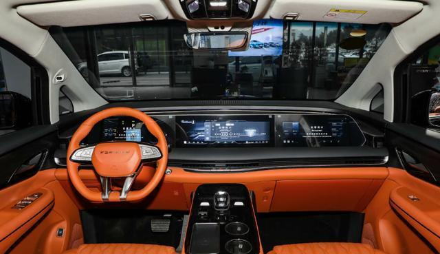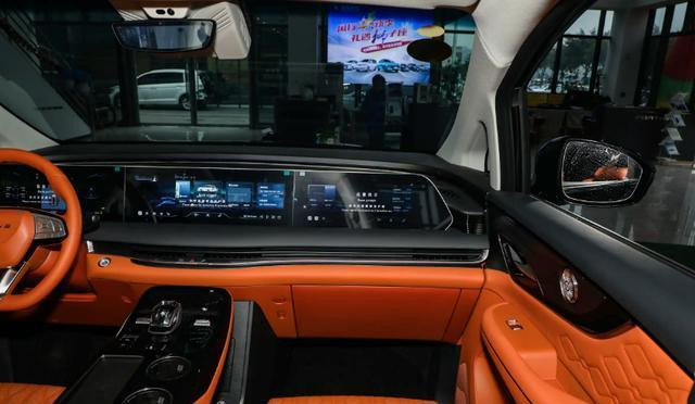内饰以橙黄黑灰双色设计,橙黄部分为软质磨砂材料,手感上乘。简约风格,中控屏16.2英寸,副驾屏12.3英寸,支持多种车载应用及升级,后排设多媒体屏,人机交互良好。